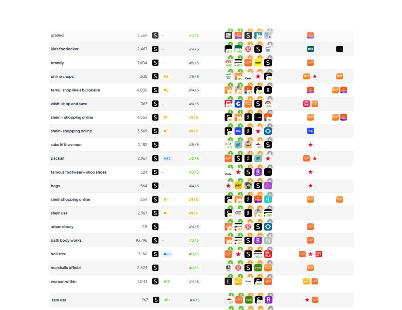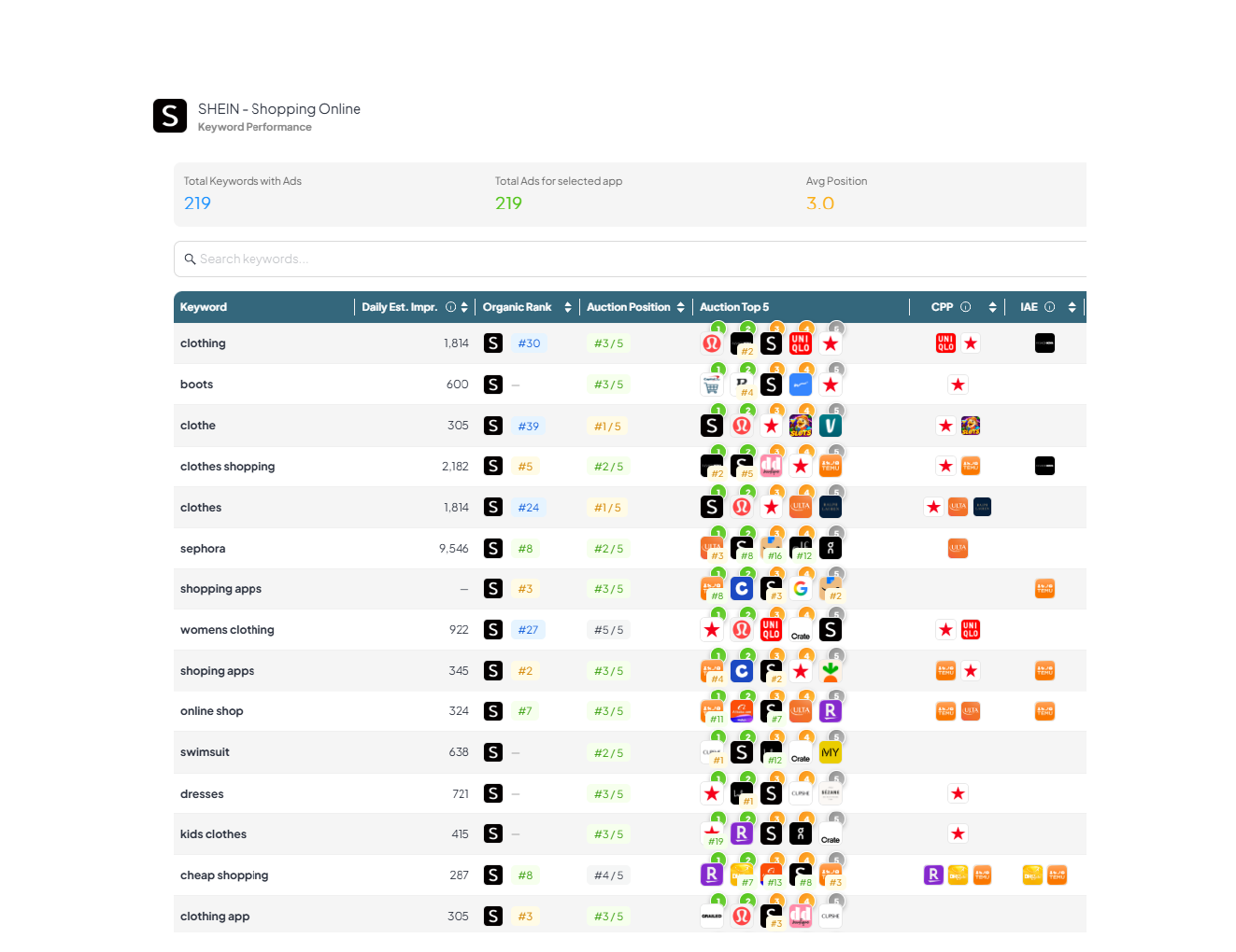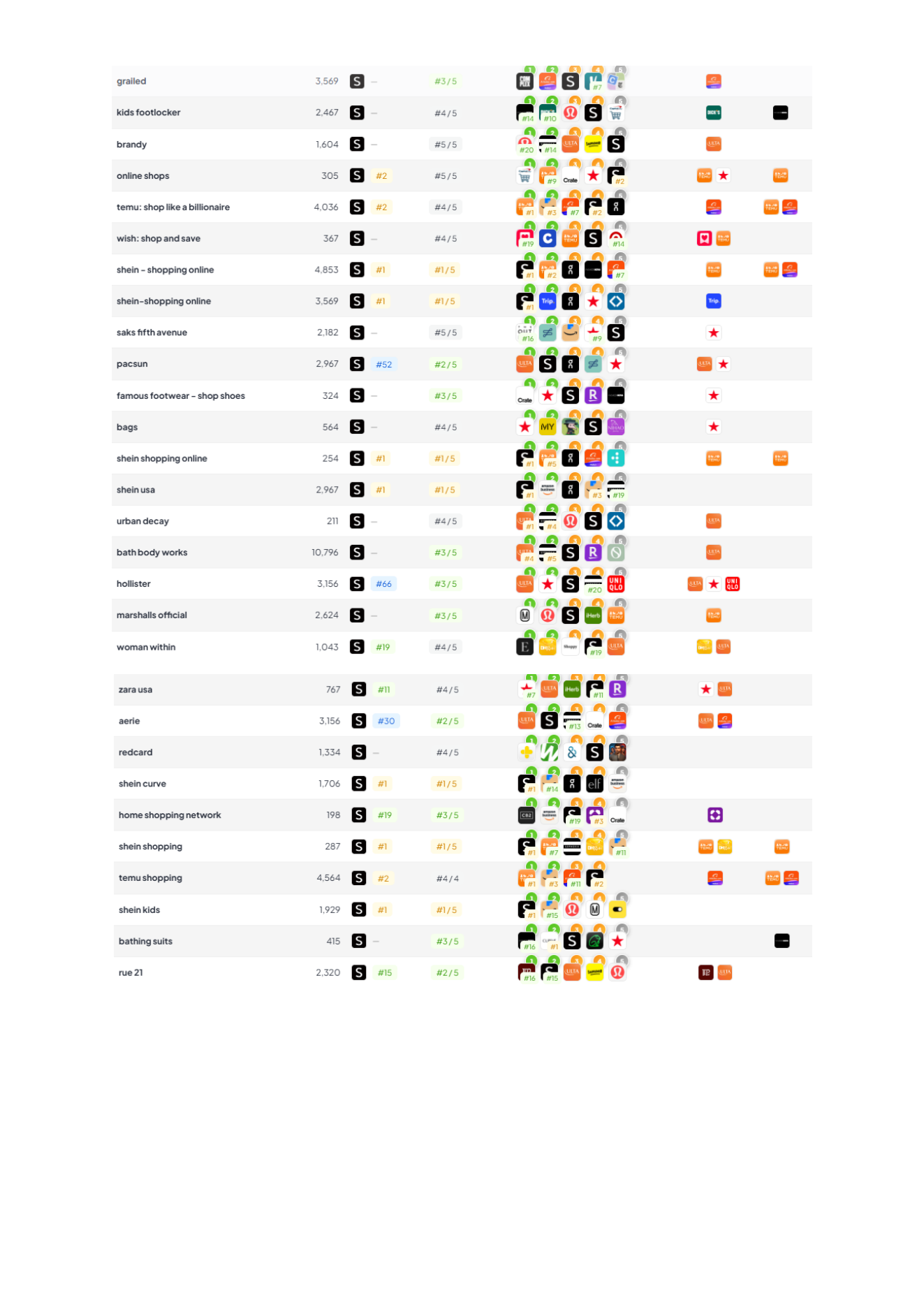 | shein | #1 | ~39,278 | Brand demand, useful for incrementality checks vs Apple Search Ads. |