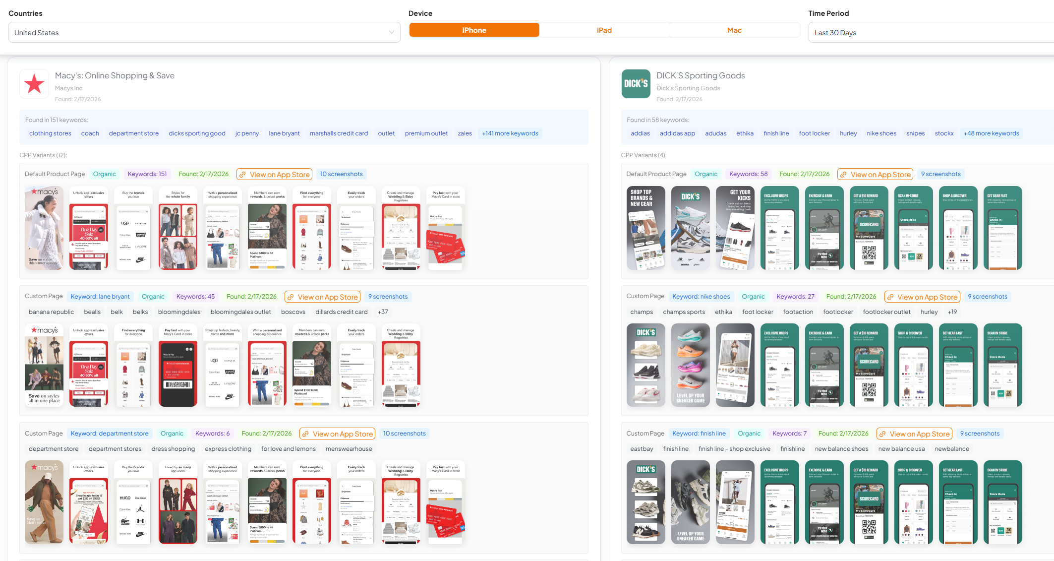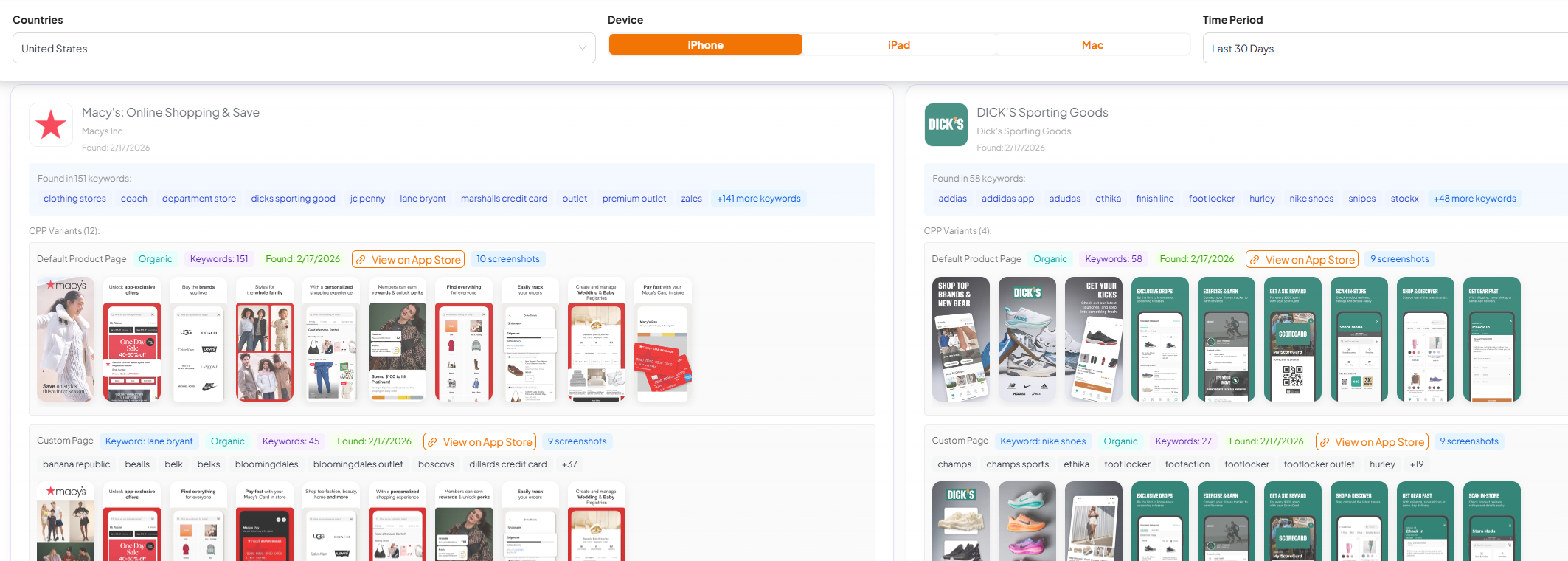 - CPP discovery: find which apps are using organic CPPs, what the variant looks like, and the keyword clusters that trigger it.