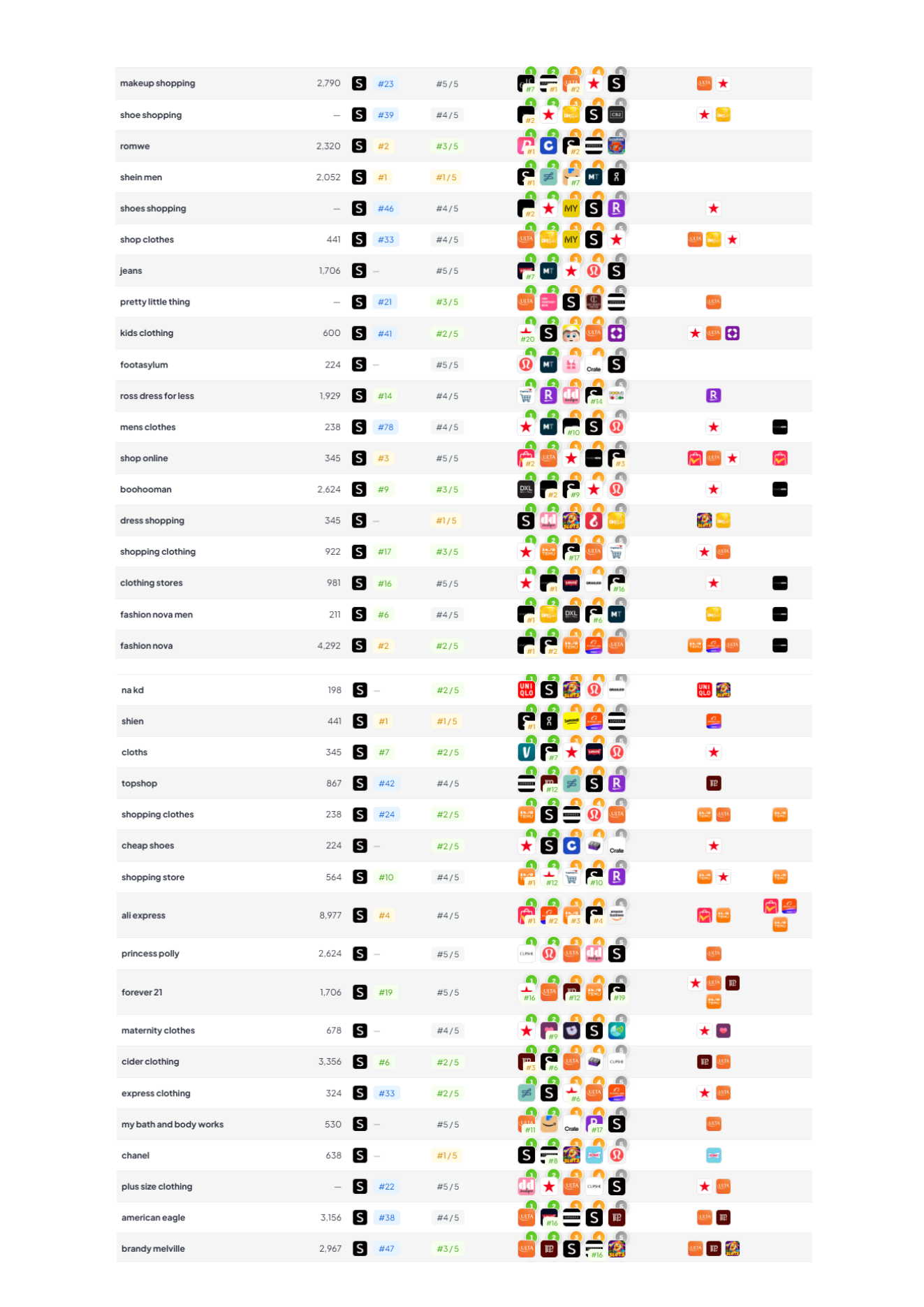 | shein | #1 | ~39,278 | Brand demand, useful for incrementality checks vs Apple Search Ads. |
