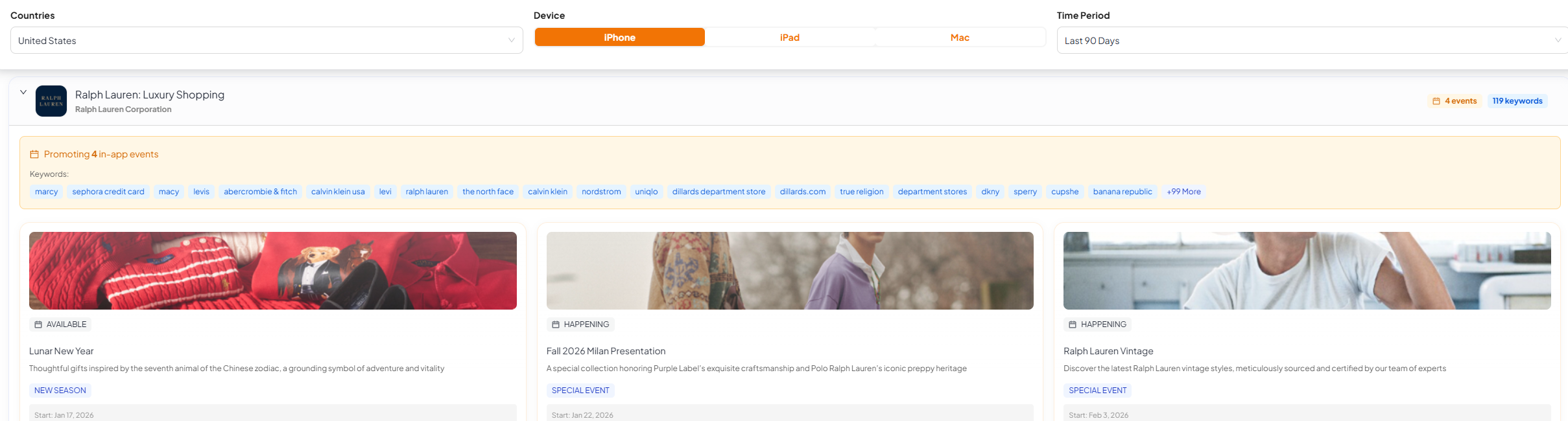 A solid store intelligence platform shouldn’t just show your default page. It should show the variants competitors are running and the keywords/events they’re attached to.