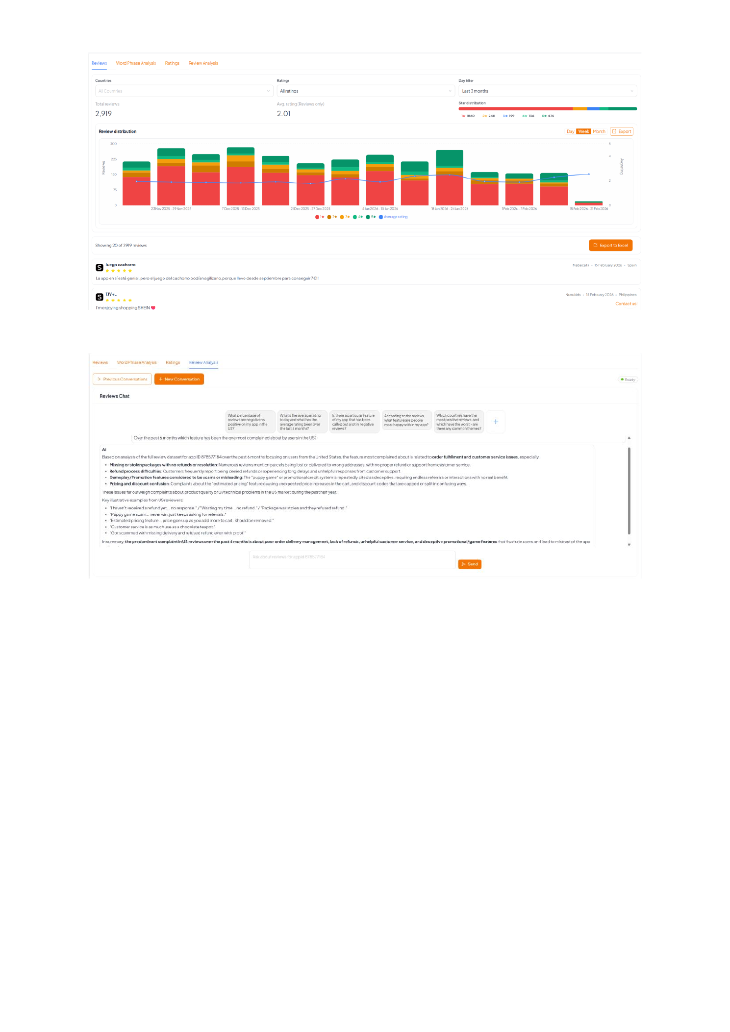 - Ratings trend + distribution: see whether you’re accumulating 1–2★ pain (or 4–5★ praise) over time, not just an average.